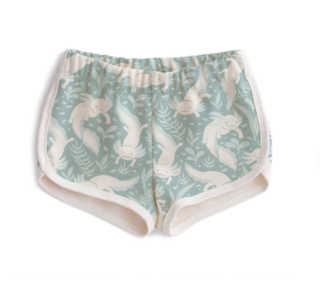 Our french terry shorts in our Axolotls print featuring these cute aquatic creatures swimming all about.