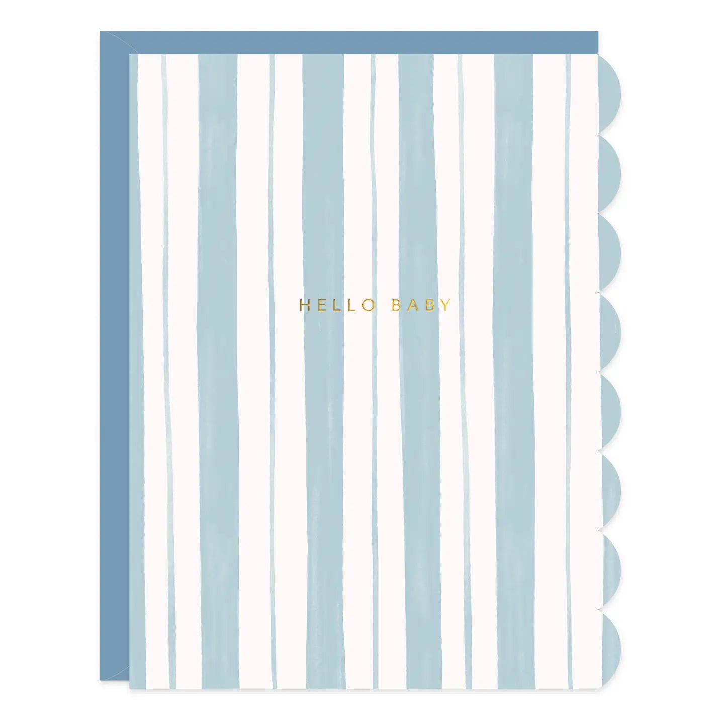 Welcome the new little one with charm and sweetness. This baby card features classic blue stripes and delicate gold foil lettering offering a soft, joyful way to celebrate a new arrival. Scalloped edging adds a playful touch to this timeless design—perfect for baby showers, newborn gifts, or just-because notes to new parents.
