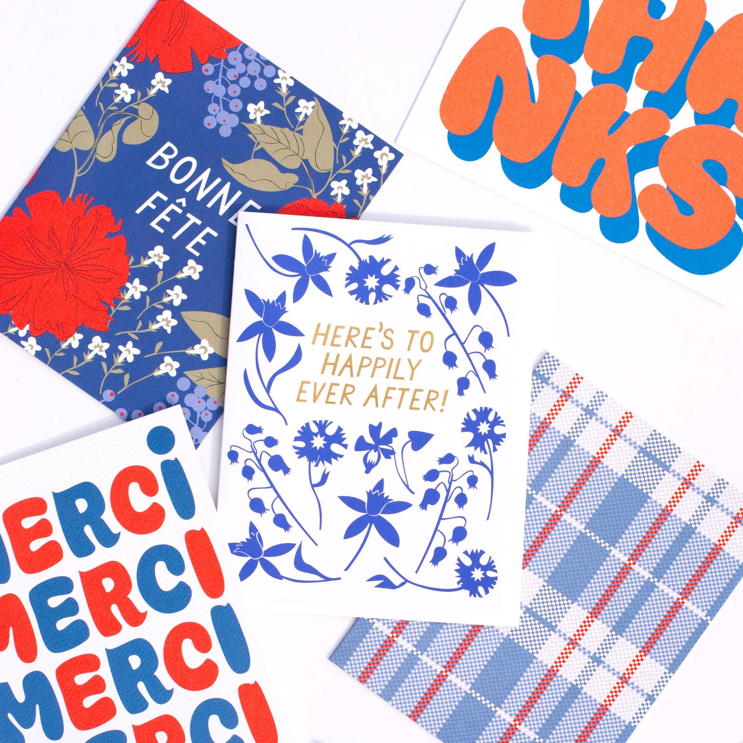Love love love this new colour combo of a cool blue and bright red with a few taupe leaves thrown in for good measure. Big blousy roses make for a super Happy Birthday card (Bonne Fête is happy Birthday en français!)