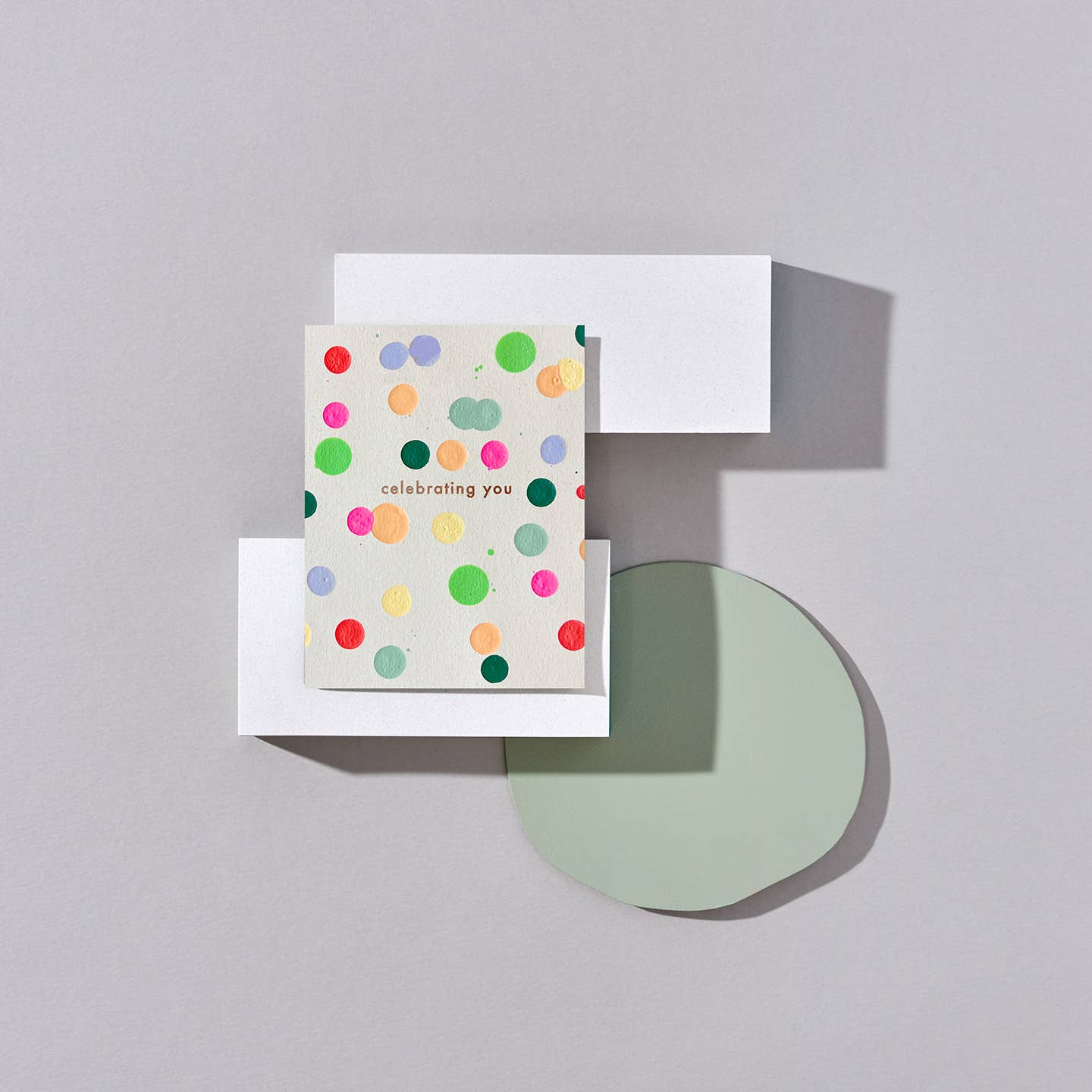 Hand-painted folded card with copper foil. Each card has a unique abstract design. Paired with a patterned envelope. Painted and foil stamped in our Iowa based studio.