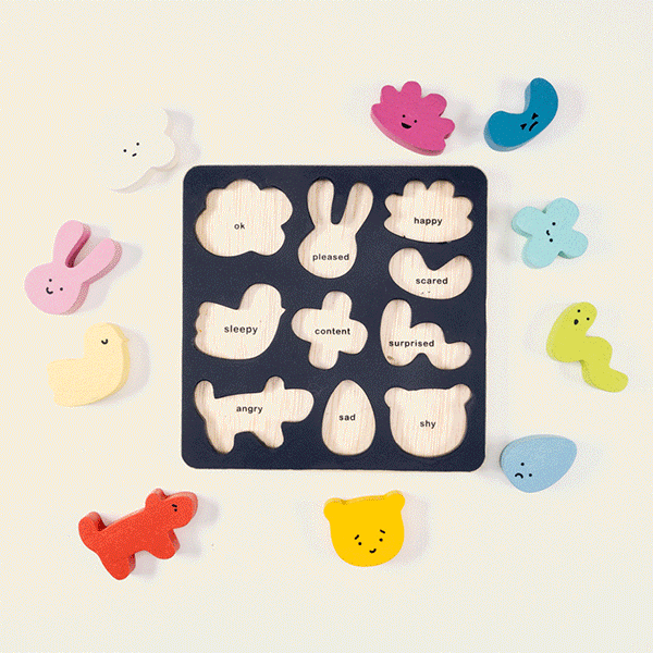 A striking and fun play on the word mood board - A shape sorter with each shape having an expression with the corresponding mood written on the base board. Explore the use of colour and shape to portray a different feeling. This toy encourages language skills as well as manual dexterity.