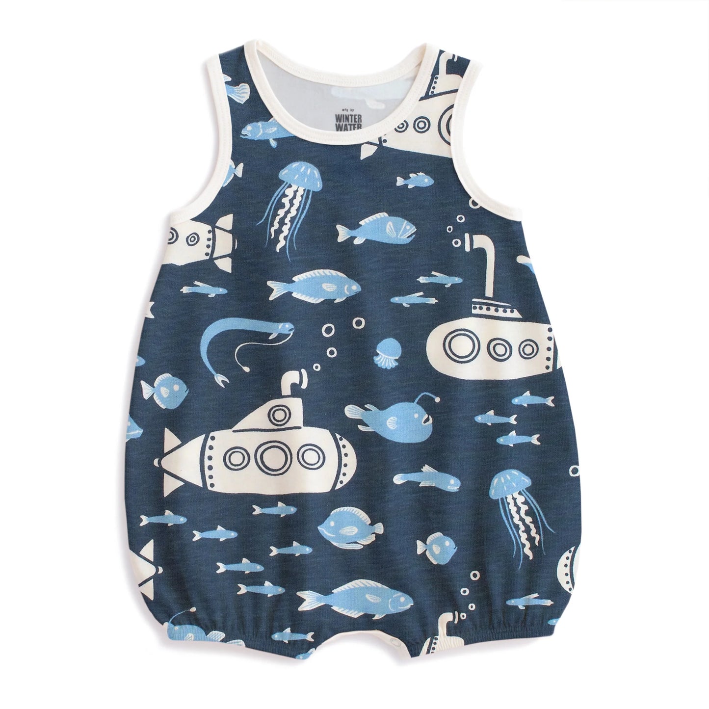 The sweetest little bubble romper in our Submarines print featuring cool underwater vehicles floating amongst the fish.