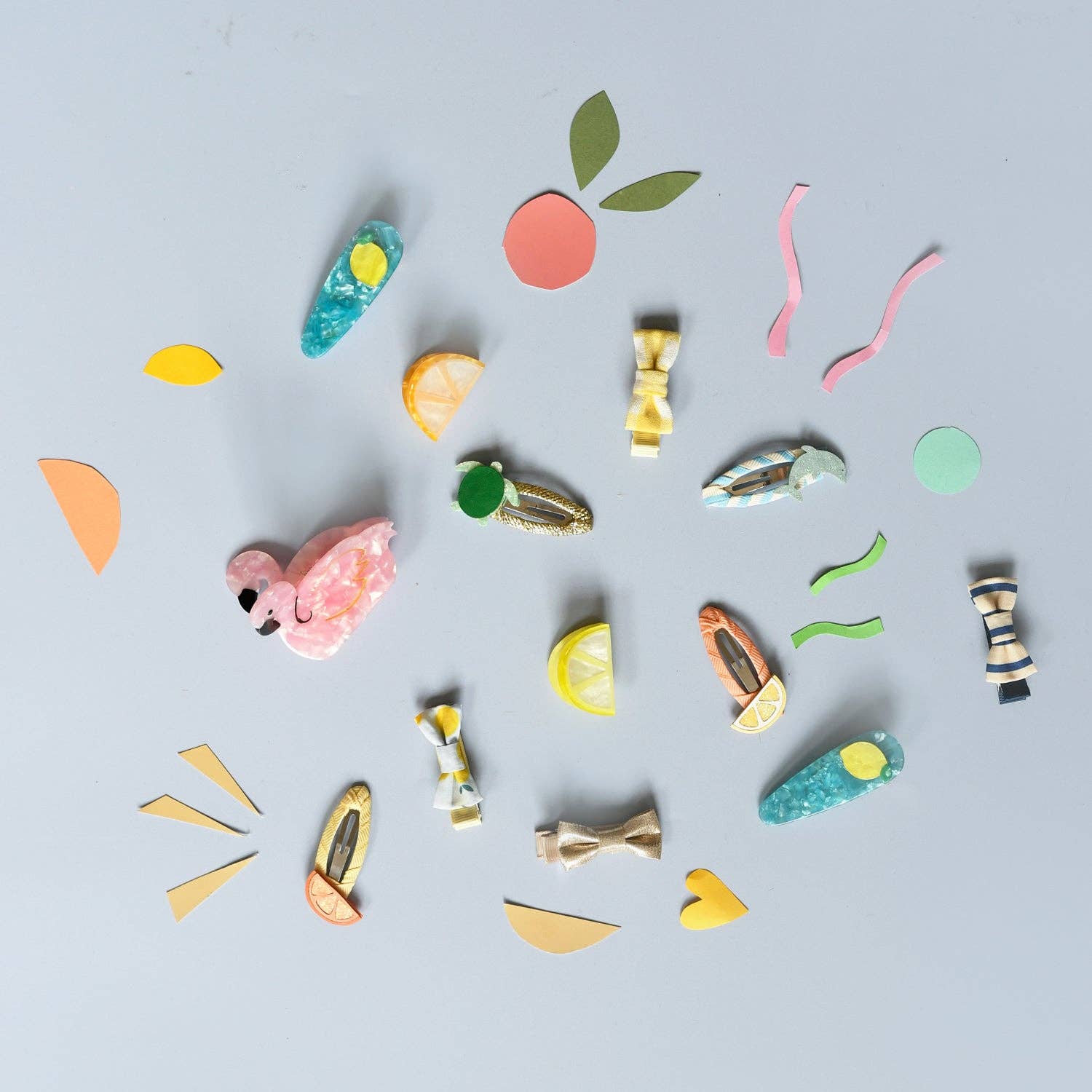 Dive down into the deep blue sea and discover the magic that lies under the sea! This set of two clips features our sweet little turtle with little flippers and our darling dolphin made in shimmering blue glitter! Each secured to a spotty ribbon wrapped snap clip.